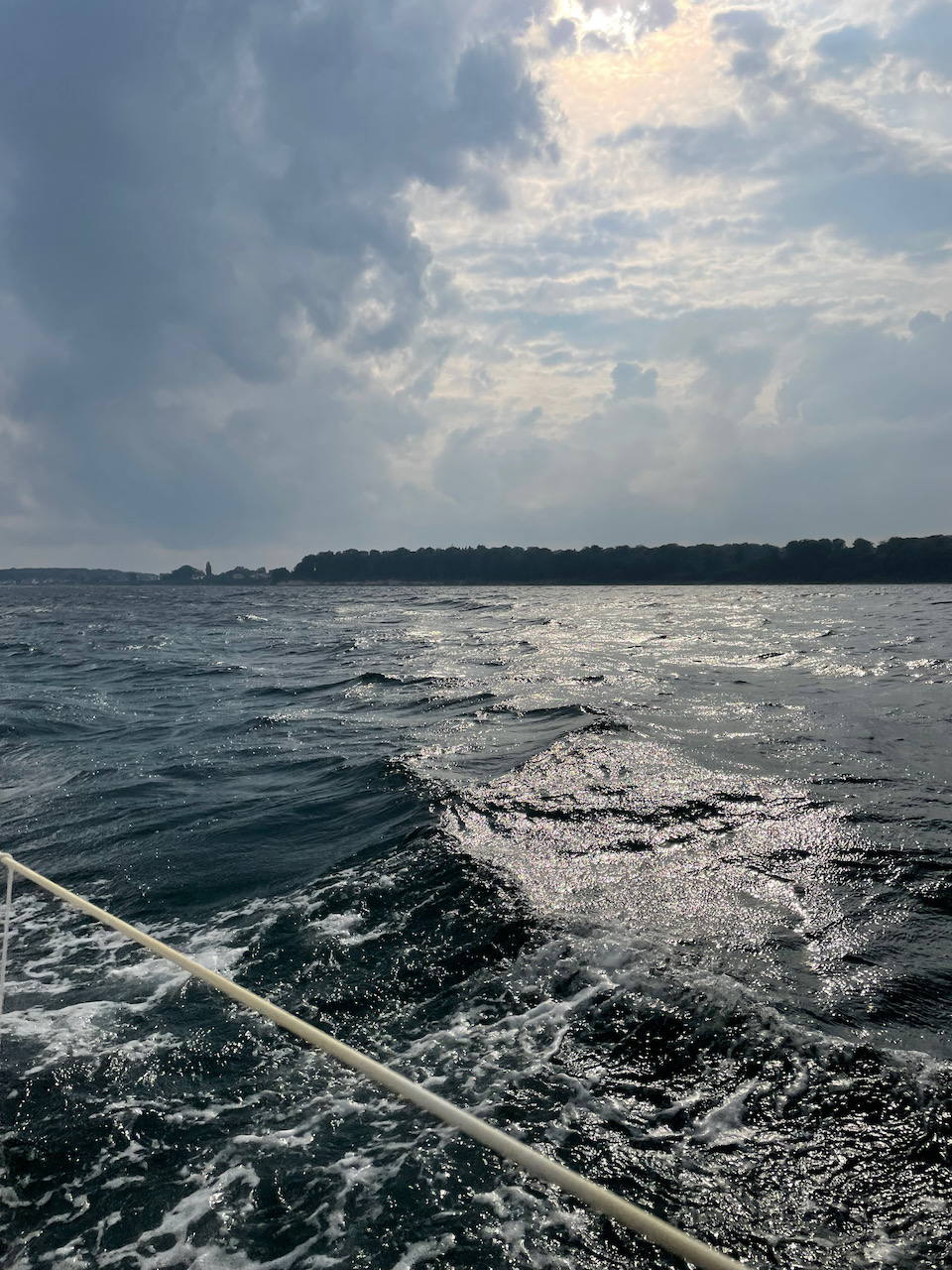 Eigentlich ist guter Wind, also segeln wir los, natürlich müssen wir kreuzen, aber das wäre ja auch nicht schlimm. Ärgerlich ist nur der Gegenstrom, der uns immer wieder zurück versetzt und für eine schnelle Fahrt ist der Wind nicht passend. Also schleichen wir uns in Landnähe Richtung Brücke in der Hoffnung, dass der Gegenstrom dort nicht ganz so ausgeprägt ist. Als wir in die Nähe der Brücke kommen, können wir dem Gegenstrom von etwa 2 Knoten (!) nicht mehr entkommen, unter Segeln und Motor schaffen wir es gerade so die Brücke zu passieren und danach wieder frei zu kommen. Unglaublich! Wir haben über 9 Stunden für die Strecke gebraucht und als wir dann in Nyborg angelegt haben waren wir richtig müde. Dieses Jahr ist wirklich hart. Also Tag 1 der anstrengenden Rücktour hinter uns gebracht. Hoffentlich wird das besser!
