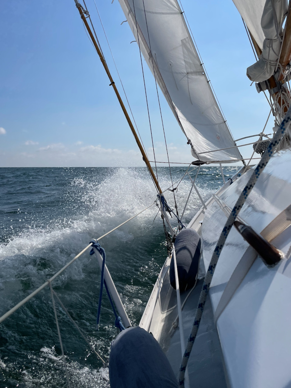 Bei Südwest 4 starten wir schon kurz nach 9 Uhr, die Vorhersage sagt Westwind voraus, also gut für die geplante Strecke. Sehr viel Welle, leider kein Westwind, den ganzen Tag nicht. Also segeln wir unter Motorunterstützung, damit wir überhaupt in den Wellen Fahrt voraus machen. 5 Stunden lang schiebt uns der Motor Richtung Kiel, 2 Stunden vor Kiel flaut der Wind dann etwas ab, die Welle wird ein bisschen weniger, wir segeln ohne Motor weiter. Eine Erholung, es ist plötzlich so leise, das Großsegel kann auch ausgereift werden, seit 5 Tagen ist das Reff jetzt drin. Um 17:30 Uhr haben wir dann in Kiel angelegt, ziemlich müde und hungrig. Schnell noch eine Pizza geholt.