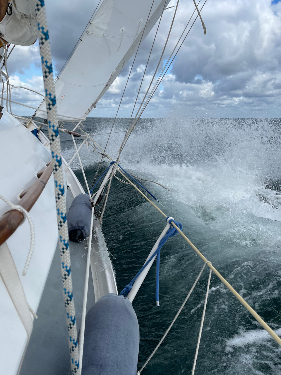 Nach längerem Überlegen und Einschätzen der Wind- und Wetterlage fahren wir doch los, noch viel Welle aber nicht mehr so schlimm wie gestern. Der Wind aus West mit etwa 5 Windstärken ist sehr böig, Max refft die Fock damit man überhaupt noch in der Welle segeln kann. Richtung Snekkeløb aufgekreuzt, die Durchfahrt gut genommen. Danach eine heftige Windbö zum Winddreher auf Nordwest, eine große Welle ist in die Pflicht geschwappt und kaum wieder abgelaufen. So gut es ging erst mal alles Wasser aus der Pflicht geschöpft und dann bei Nordwest bis West um 5 die Insel Sejerø angesteuert. Wir haben einen guten Platz gefunden, gut geschützt für den angekündigten Starkwind morgen. Nach dem Anlegen erst mal das Gasschapp trockengelegt und danach 3 Stunden hart gearbeitet, um alle Fächer zu kontrollieren. Warum? Beim „normalen“ Segeln oder bei Regen ist Wasser überhaupt kein Problem, aber wenn so eine große Welle in die Pflicht einsteigt, hebt es die Deckel von den Schapps in der Pflicht ein ganz klein wenig an. Und zum Kontrollieren, ob Wasser eingedrungen ist, muss man die Fächer im Innenraum ausräumen, was dann doch ein bisschen Chaos verursacht. Na ja, war alles halb so schlimm, nur ganz wenig Feuchtigkeit, aber bis man alles wieder eingeräumt hat dauert es. Dieses Jahr ist wirklich ungewöhnlich was die Wetterlage angeht.